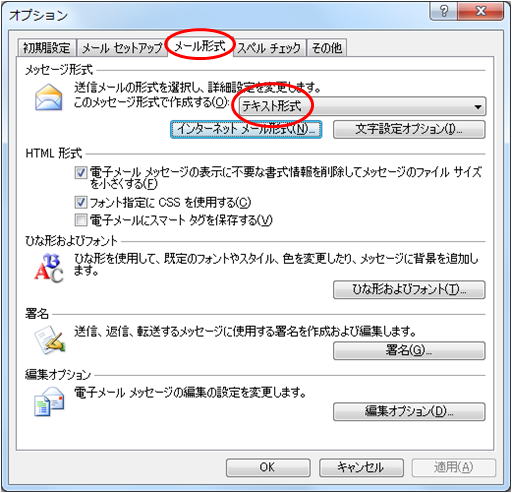 [インターネットメール形式] [テキスト形式で送信]を選択→[OK]をクリックし閉じる